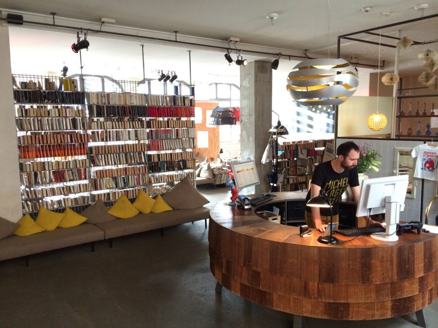 A la fois contemporain, alternatif, décalé et rétro, le Michelberger mélange les styles pour une expérience unique. L’entrée de l’hôtel est lumineuse et spacieuse avec de nombreux canapés, une belle bibliothèque métallique  faisant office de séparation avec l’espace bar et la réception. Chaque recoin de l’hôtel est joliment décoré avec du mobilier original, des lustres hors-normes conçus à base de pages de magazines, d’anciennes valises empilées pour habiller un angle de mur, etc…