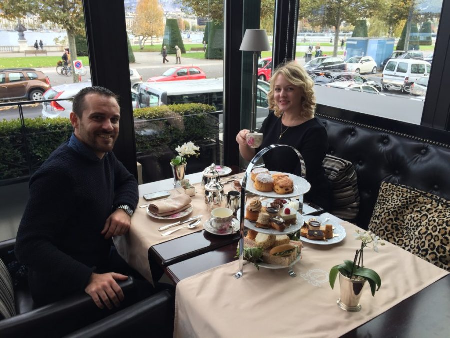 A 15h nous étions attendu à l’hôtel d’Angleterre pour un English Tea Time. Original pour Genève on vous l’accorde… Mais même si nous avons été de nombreuses fois au Royaume Uni, nous n’avons jamais apprécié un moment comme celui-ci ! Il n’y a qu’à regarder le cadre, cette vaisselle raffinée, ces délicieuses pâtisseries et cette vue imprenable sur le lac ! Un régal…